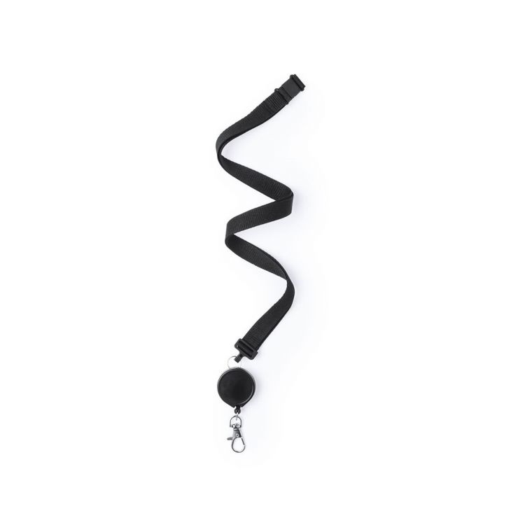 Longe pratique en polyester avec accessoire rétractable. Fermeture de sécurité au cou et accessoire extensible avec clip d'un côté, laissant l'autre côté vide pour le logo. Mousqueton en métal. Ensemble disponible en couleurs blanc et noir.