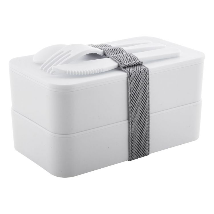 Lunch box antibactérien en plastique avec set de couverts (fourchette, cuillère et couteau) et sangle élastique. Avec 2 compartiments de 700 ml chacun. Conforme à la norme ISO 22196, de couleur blanche