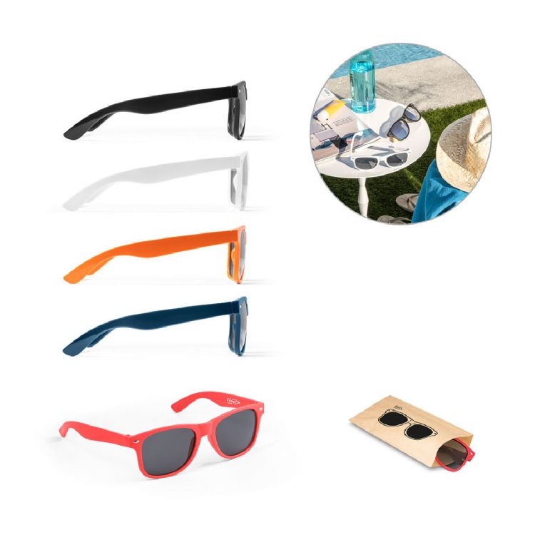 Lunettes de soleil en polyester recyclé (100% rPET) avec verres de catégorie 3 avec protection UV400. Conforme aux normes EN ISO 12312-1. Livré dans un sac en papier naturel