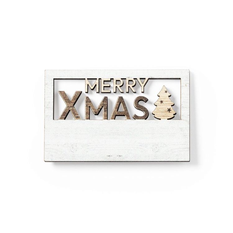 Aimant original Merry Christmas en bois naturel, avec texte découpé et une finition bicolore originale. Grande surface de marquage et caractéristique Made In Europe. (couleur naturel)