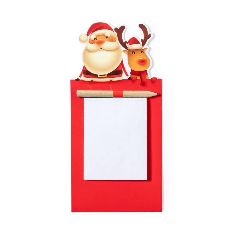 Aimant avec un bloc-notes dans un design amusant de Noël Père Noël et renne. Comprend 40 feuilles unies et un crayon en bois naturel. (couleur rouge)