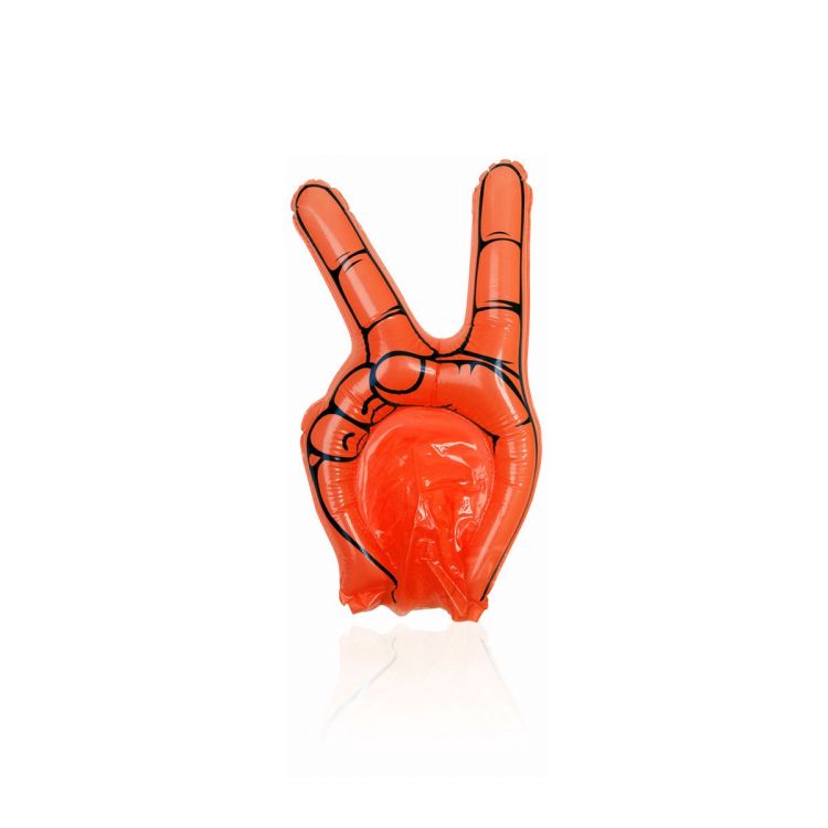 Main gonflable pour animation en forme de V de victoire en LDPE résistant. Réutilisable avec sa valve de gonflage incluse. Coloris divers.