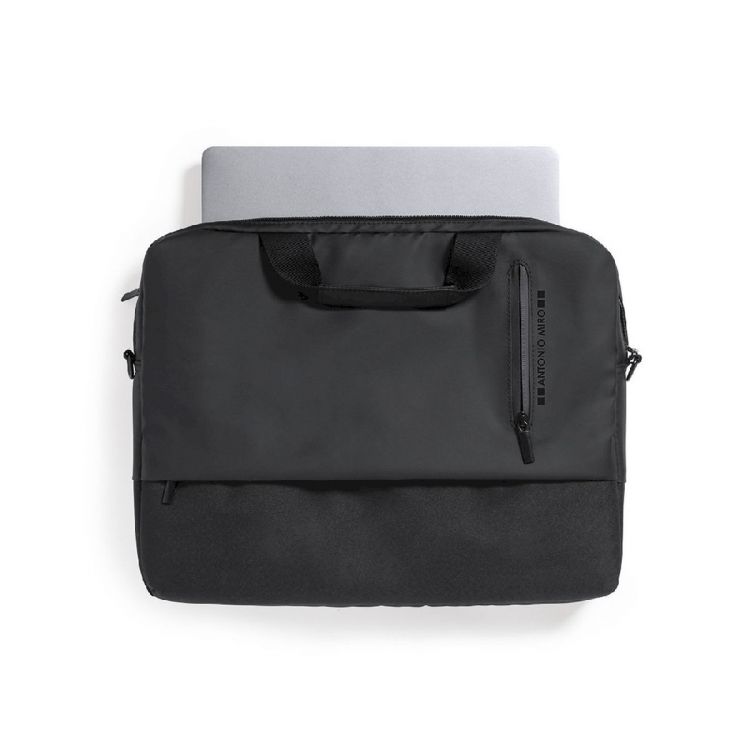 Porte-documents dAntonio Miró de qualité supérieure en polyester 600D durable. Avec un design sobre et un compartiment rembourré pour les ordinateurs portables jusquà 15. Avec une confortable poignée de transport renforcée, des fermetures à glissière avec des poignées en métal et une poche avant. Logo de la marque sur le frontal. (couleur noir)
