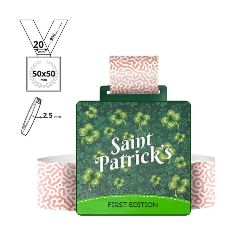 Médaille carrée imprimée en quadrichromie sur la face avant et comprenant un tour de cou de 20x900 mm entièrement personnalisable. Grâce au traitement spécial - découpe au laser et impression UV en couleur sur toute la surface - nous pouvons réaliser toutes les personnalisations demandées par le client. Le revers de la médaille est teinté en noir.