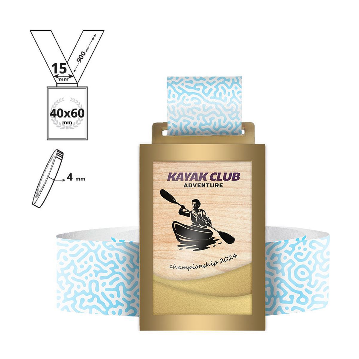 Médaille rectangulaire réalisée à partir de deux matériaux combinés : bord en acier de 8 mm de largeur et intérieur en contreplaqué, imprimée en quadrichromie sur le recto et comprenant un tour de cou de 15x900 mm entièrement personnalisable. Grâce à la découpe spéciale au laser et à l'impression UV en quadrichromie sur toute la surface, nous pouvons réaliser toutes les personnalisations demandées par le client.