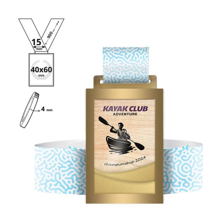 Médaille rectangulaire réalisée à partir de deux matériaux combinés : bord en acier de 8 mm de largeur et intérieur en contreplaqué, imprimée en quadrichromie sur le recto et comprenant un tour de cou de 15x900 mm entièrement personnalisable. Grâce à la découpe spéciale au laser et à l'impression UV en quadrichromie sur toute la surface, nous pouvons réaliser toutes les personnalisations demandées par le client.
