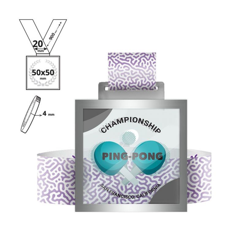 Médaille carrée composée de deux matériaux combinés : bord en acier de 8 mm de largeur et intérieur en plexiglas, imprimée en quadrichromie sur le devant, et comprenant un tour de cou de 20x900 mm entièrement personnalisable. Grâce à la découpe spéciale au laser et à l'impression UV en quadrichromie sur toute la surface, nous pouvons réaliser toutes les personnalisations demandées par le client.