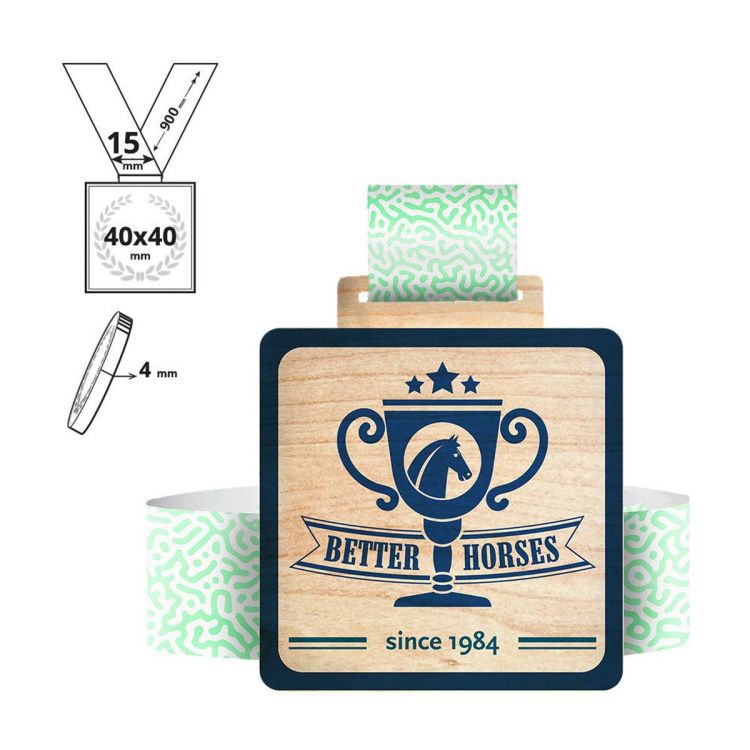 Médaille carrée imprimée en couleurs sur la face avant et comprenant un tour de cou de 15x900 mm entièrement personnalisable. Grâce au traitement spécial - découpe au laser et impression UV en quadrichromie sur toute la surface - nous pouvons réaliser toutes les personnalisations demandées par le client.