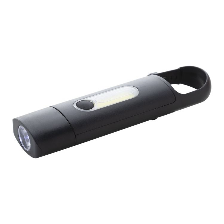 Mini lampe de poche en ABS recyclé avec batterie rechargeable USB intégrée (200 mAh) et mousqueton. Avec lumière COB sur le devant et projecteur COB sur le côté. Avec 3 modes d'éclairage. Câble de chargement USB inclus, de couleur noir