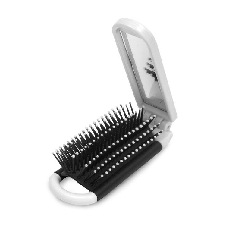 Miroir de poche avec brosse pliable. Produit en couleur blanche