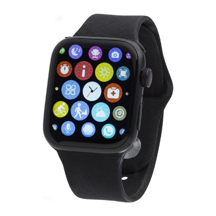 Montre connectée avec boîtier en métal et bracelet en PVC avec écran tactile munie des fonctions appels, cardiofréquencemètre, suivi du sommeil, oxymètre, rappel de message, alerte d'hydratation, rappel d'exercice physique, livrée avec câble de charge dans une boîte cadeau.