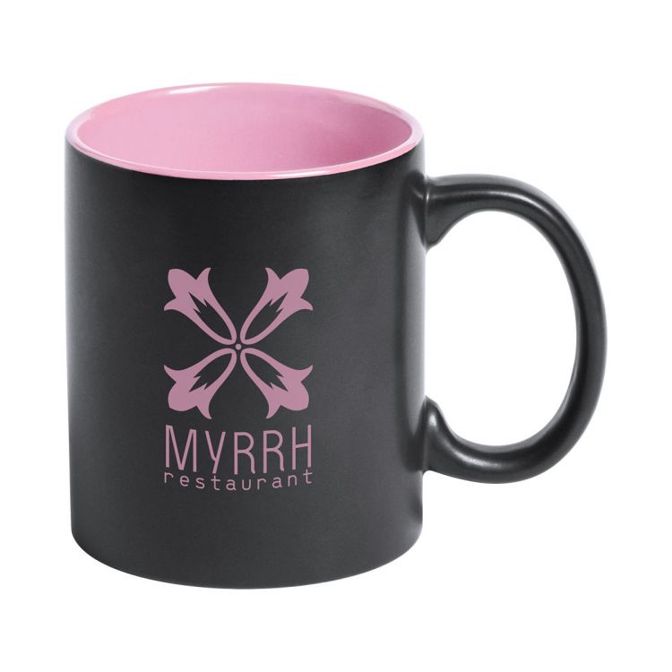 Mug noir en céramique avec intérieur coloré. 350 ml. Revêtement spécial permettant de graver le logo de la couleur de l'intérieur du mug. Livré dans une boîte cadeau.