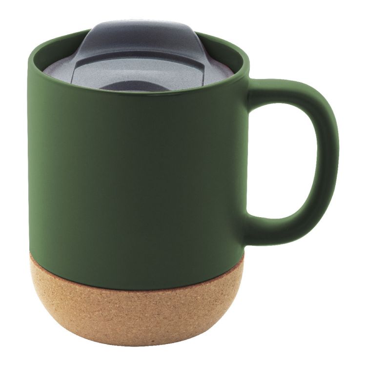 Mug en céramique de qualité supérieure avec base en liège naturel et couvercle en plastique PP. Finition mate à l’extérieur et brillante à l’intérieur. 325 ml. Livré dans une boîte en papier kraft.