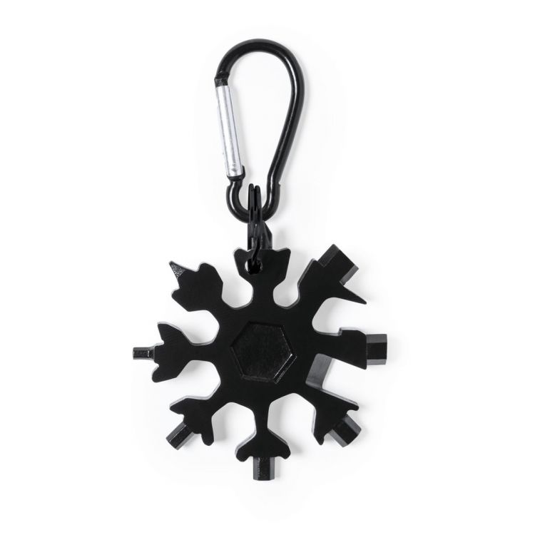 Outil multifonction original et pratique en acier inoxydable résistant avec une finition noire, avec anneau et mousqueton assortis. Avec 17 fonctions, entre autres, tournevis plat et cruciforme clés hexagonales de type Allen couteau et décapsuleur. Présenté dans une boîte noire individuelle. (couleur noir)