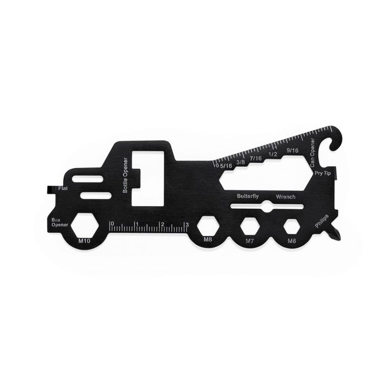 Original et pratique multi-outils en acier inox en forme de camion. Avec 18 fonctions, entre autres : tournevis à bout plat et Philips, clé pour écrous hexagonaux en différentes tailles, règle, ouvre-boîte et ouvre-bouteille. Présenté dans un sac en papier recyclé. (couleur noir)