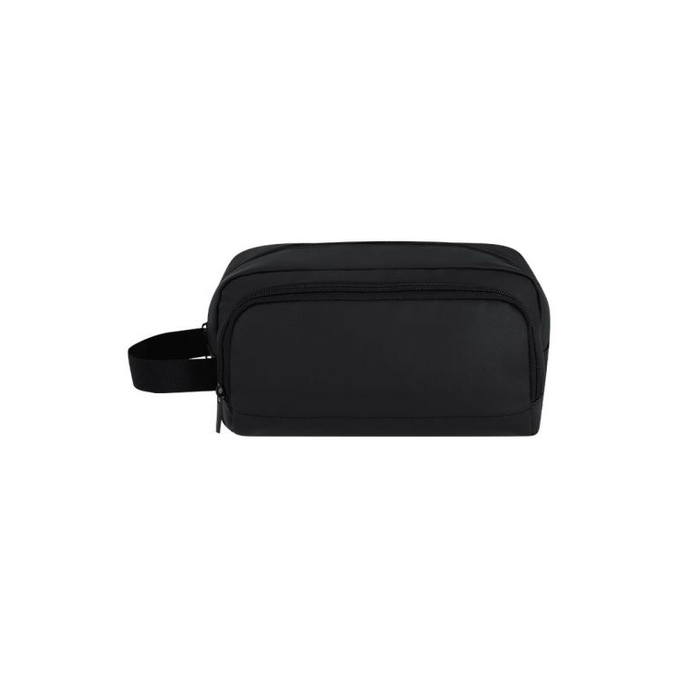 Nécessaire multi-usages en doux PU. Poche principale et poche frontale, avec fermetures éclair et tirettes métalliques. Et pratique anse de main pour un transport confortable. (couleur noir)