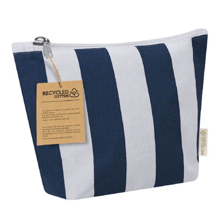 Trousse fabriquée principalement en coton recyclé 220 g/m², au design élégant à rayures verticales. Compartiment principal avec fermeture éclair. Comprend une étiquette extérieure avec le logo coton recyclé.