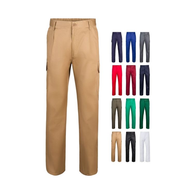 Pantalon multipoches en sergé (200g/m²), en coton (35%) et polyester (65%). Avec ceinture élastiquée et six poches (2 poches françaises, 2 poches à soufflet latérales et 2 poches à soufflet arrière)