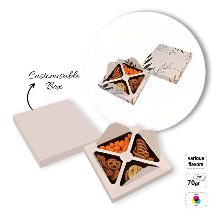 Pack collation mixte (70 g) : mini bretzels, chips de banane et cacahuètes aux coquilles croquantes. Conditionnement : boîte en papier avec ouverture sur le dessus, entièrement personnalisable (finition papier : blanc ou kraft, à choisir lors de la commande). Durée de conservation minimale - 6 mois.