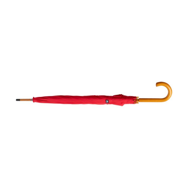 Parapluie automatique 8 panneaux, cadre en métal, manche et poignée en bois. En 190T RPET et labélisé RPET.