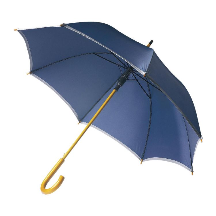Parapluie golf automatique en polyester 190T avec galon réfléchissant, baleines en métal, mât et manche canne en bois.
