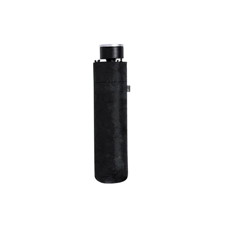 Parapluie pliant de 98 cm de diamètre. En matière pongé RPET 190T. Ouverture manuelle, avec système anti-vent et tiges en fibre de verre. Avec poignée ergonomique avec poignée de transport pratique en métal, étui de transport assorti et fermeture velcro assortie. Avec étiquette distinctive RPET. Présenté dans un sac recyclé individuel.Le matériau RPET est fabriqué à partir de plastique recyclé, afin de favoriser la réutilisation des déchets plastiques et d'aider à la durabilité de la planète. (couleur noir)