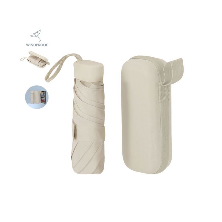 Parapluie pliable de 90 cm de diamètre en polyester 190T à 6 panneaux. Avec ouverture manuelle, système antivent et tiges en fibre de verre. Poignée compacte et sangle assortie. Présenté dans une housse de transport rigide fabriquée en PU avec fermeture éclair et sangle assortie.