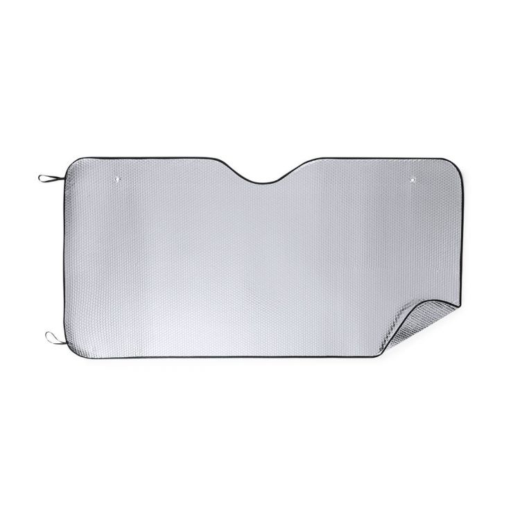 Pare-soleil en aluminium avec bulles sur les deux côtés en coloris argent métallisé et liseré noir. Grande taille de 180 x 90cm, avec anneaux de renfort en métal, sangles élastiques pour le pliage et deux ventouses pour la fixation. Livré à plat pour faciliter l´impression. (couleur noir)