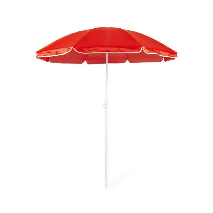 Parasol à 8 panneaux en nylon résistant décliné en plusieurs couleurs vives. Diamètre de 150cm. Jupes latérales gansées, tubes métalliques blancs réglables en hauteur. Présenté dans un fourreau en nylon avec bandoulière.