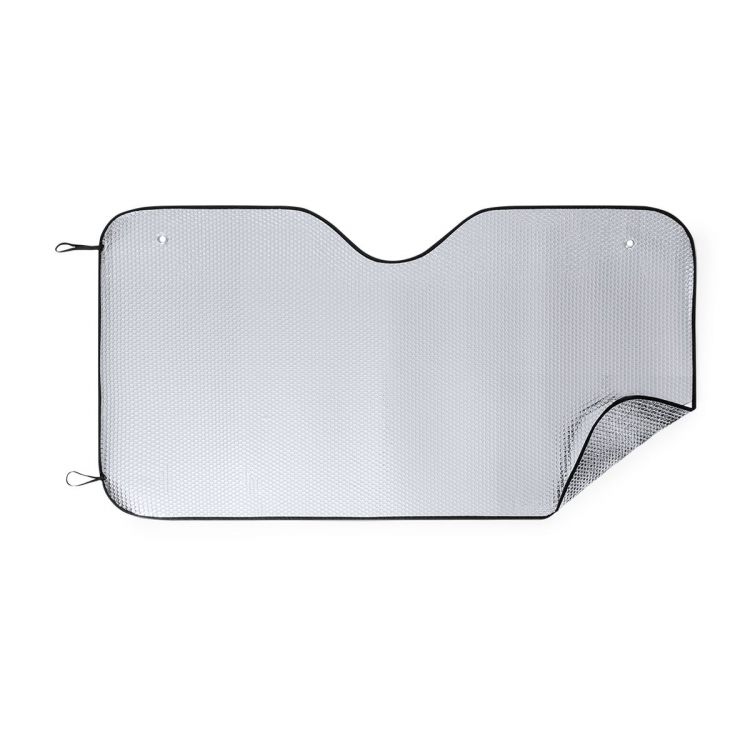 Pare-soleil en aluminium avec bulles sur les deux côtés en coloris argent métallisé et liseré noir. Dimensions 143 x 74 cm, avec anneaux de renfort en métal, sangles élastiques pour le pliage et deux ventouses pour la fixation. Livré à plat pour faciliter l´impression. (couleur naturel)