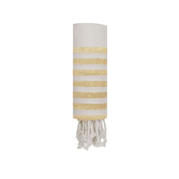 Pareo serviette en coton recyclé de 180g/m2. Design à rayures blanches en combinaison avec des rayures dorées effet paillettes, extrémités en beige lisse et magnifiques franges aux extrémités en forme de cordon. Inclut une étiquette avec le label de coton recyclé. (couleur or)