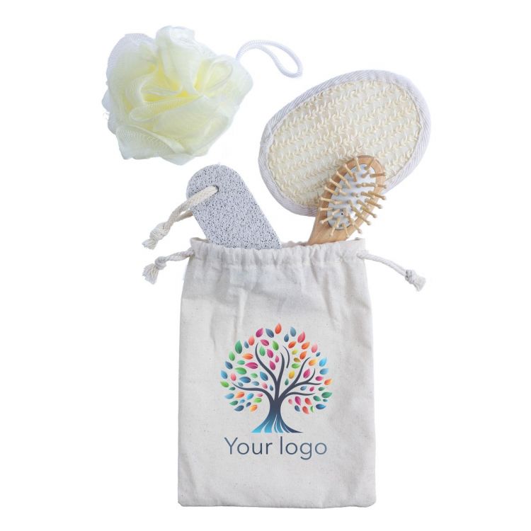 Ensemble de bain dans une pochette en coton composé de 4 ustensiles que sont la brosse en bambou, la fleur de bain, le gant en crin et la pierre ponce.