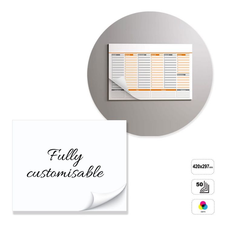 Planning de bureau horizontal, entièrement personnalisable. Le produit se compose de 50 feuilles de papier de 90 grammes collées en haut. Le produit peut être imprimé au recto ou au recto et au verso en quadrichromie. Support en carton blanc 300 g non imprimable. Le produit peut être personnalisé en modifiant le modèle prédéfini, ou entièrement construit en suivant les directives fournies dans un modèle neutre.