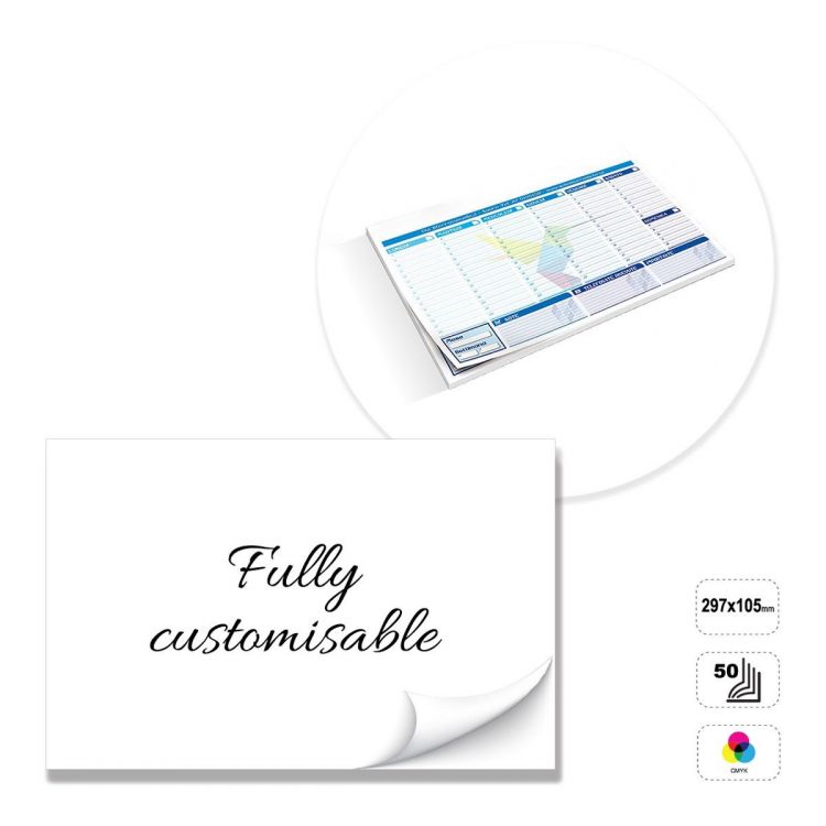 Planning de bureau horizontal, entièrement personnalisable. Le produit se compose de 50 feuilles de papier de 90 grammes collées en haut. Le produit peut être imprimé au recto ou au recto et au verso en quadrichromie. Support en carton blanc 300 g non imprimable. Le produit peut être personnalisé en modifiant le modèle prédéfini, ou entièrement construit en suivant les directives fournies dans un modèle neutre.