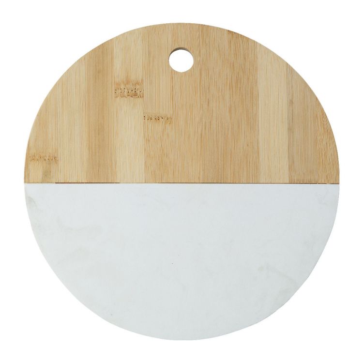 Plateau de service en bambou et pierre d'aspect marbre.