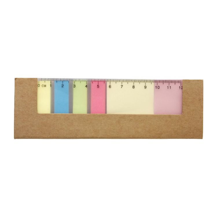 Pochette cartonnée contenant 25 marque-pages repositionnables dans chaque coloris et formats différents et une règle de 12 cm.