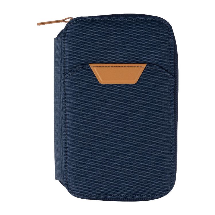 Pochette de voyage RFID zippée en rPET et PU munie d’un support de téléphone et de plusieurs compartiments et une poche frontale dans une boîte cadeau kraft.