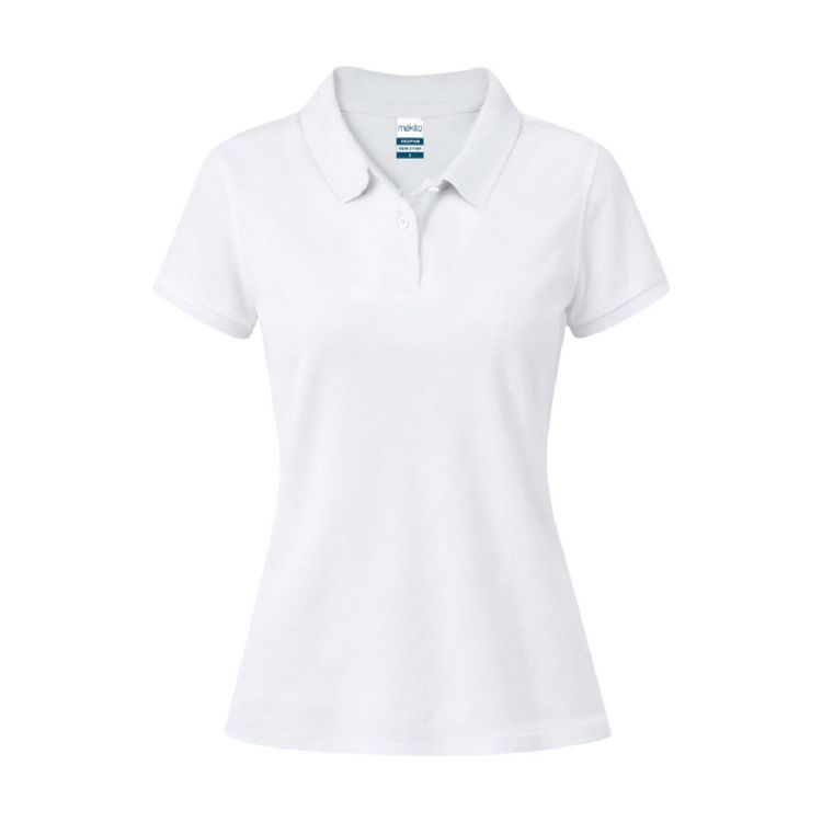 Polo en piqué pour femme en couleur blanche. En matière 100% coton de 220g/m2. Avec deux boutons de fermeture assortis et des ouvertures latérales sur le bas. Étiquette facilement détachable. Tailles S, M, L, XL, XXL.
