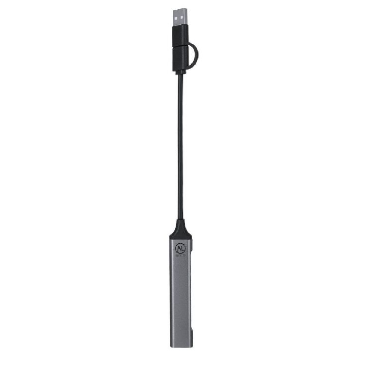 Hub USB en aluminium recyclé. Avec connexion double USB/Type C et 4 ports : 1 connexion Type C 2.0 et 3 ports USB. Avec logo en aluminium recyclé.L'aluminium recyclé est un matériau aux possibilités de recyclage presque infinies, sans perdre ses propriétés originales et en consommant moins d'énergie dans le processus.Certification GRS (Global Recycled Standard), garantissant l'origine recyclée du matériau utilisé pour fabriquer le produit. (couleur argent)