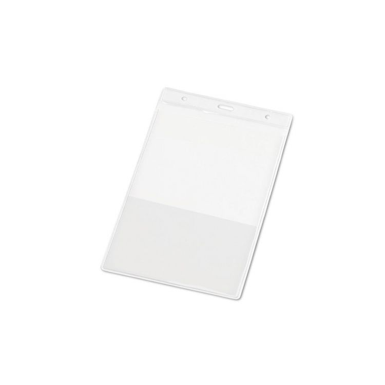 Porte-badges vertical en PVC transparent avec double poche (une des poches à pleine hauteur et l'autre à mi-hauteur), et avec trous latéraux et boutonnière centrale.