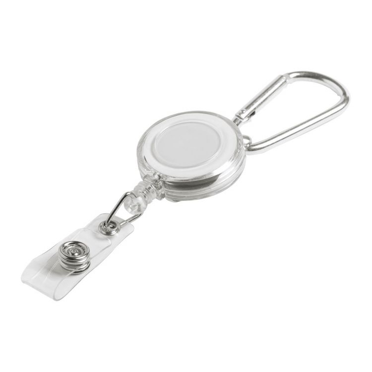 Porte-badge en plastique avec cordelette télescopique, fermeture par bouton-pression et mousqueton en aluminium, de couleur blanche