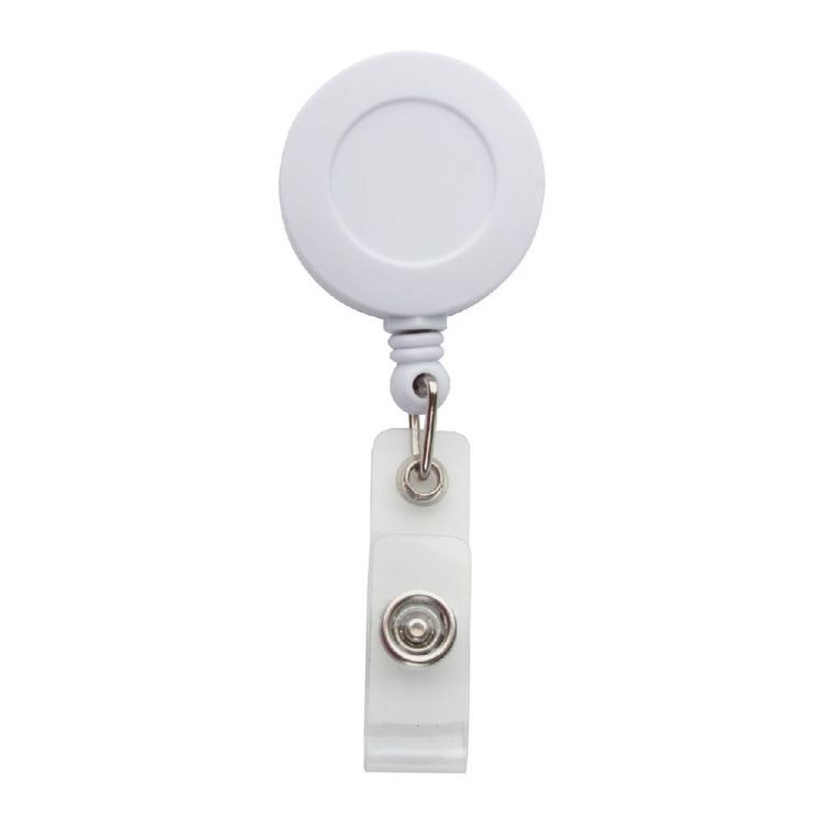 Porte-badges en plastique avec bouton pression, cordelette télescopique et clip en métal pour fixation facile. A combiner avec pochette réf AP761597.