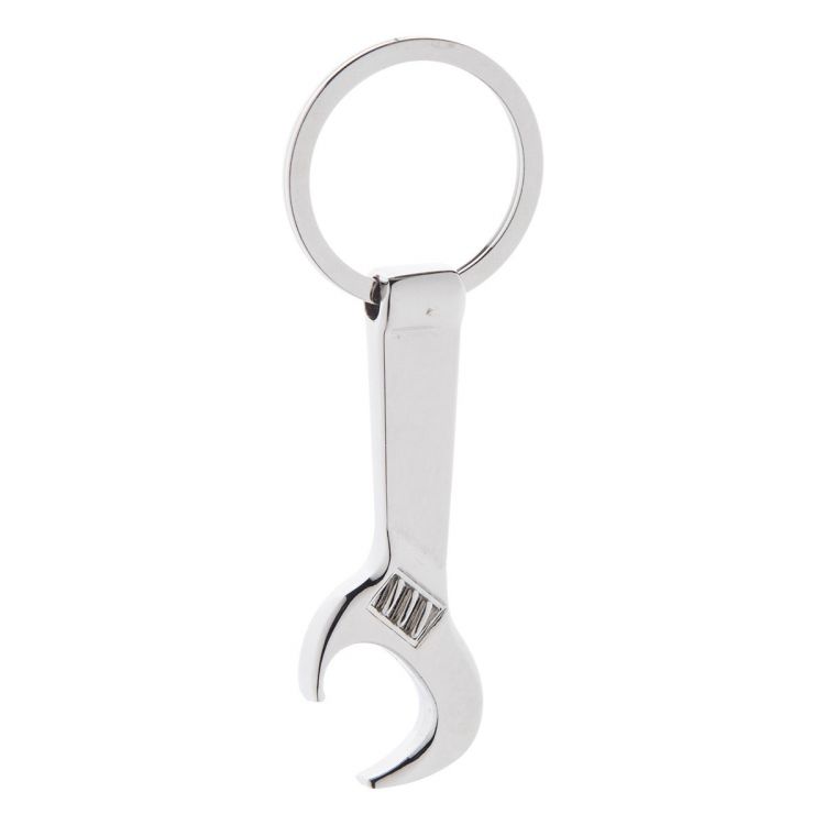 Porte-clés décapsuleur en métal en forme de clé à molette. Dans une boîte en papier kraft