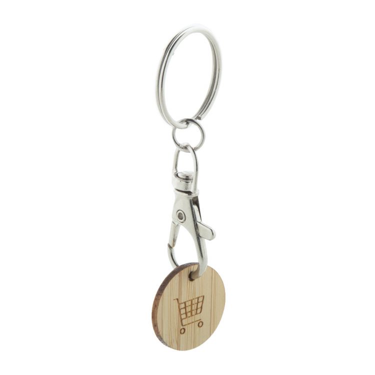 Porte-clés mousqueton en métal avec jeton de charriot en bambou. Taille de la pièce : ø23×2 mm