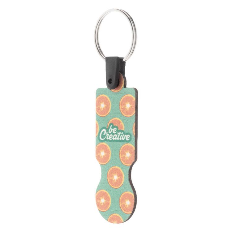 Porte-clés jeton de chariot en contreplaqué de bouleau avec impression en quadri. Le prix comprend l'impression UV LED sur une face. Quantité minimum : 200 pièces