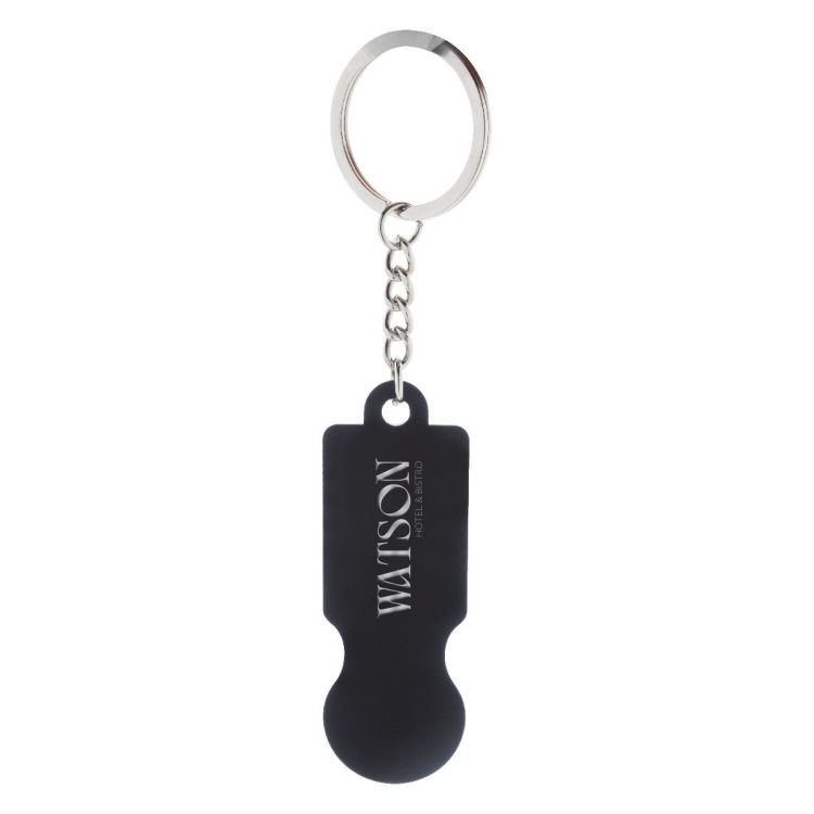 Porte-clés en acier inoxydable recyclé avec finition caoutchoutée et jeton pour chariot de courses. Revêtement spécial pour gravure laser miroir, de couleur noir
