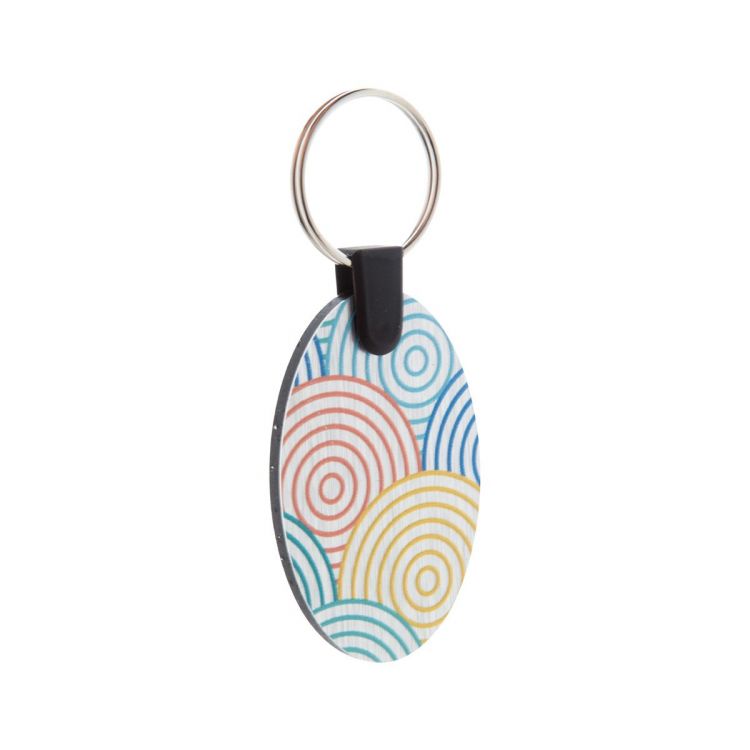 Porte-clés composite ovale en aluminium brossé avec impression quadri. Le prix comprend l'impression LED UV d'un côté. Quantité minimum: 100 pièces
