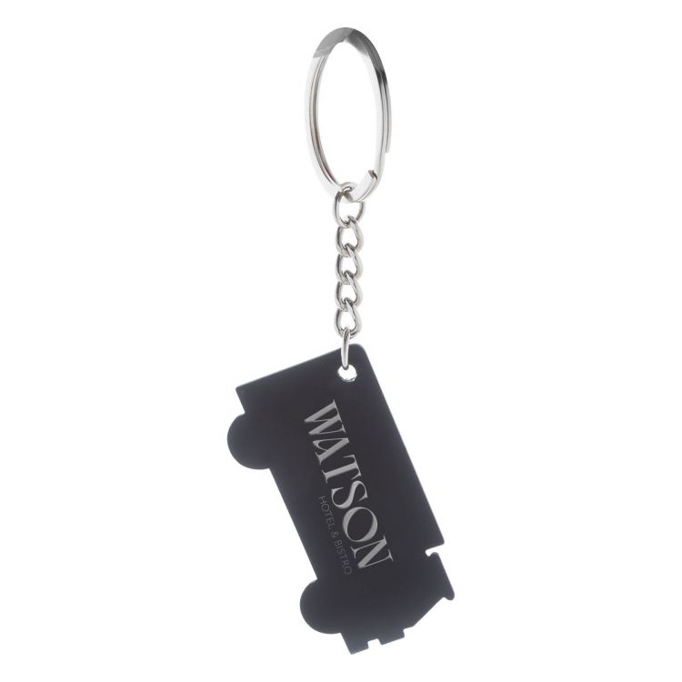 Porte-clés en acier inoxydable recyclé en forme de camion avec finition caoutchoutée. Revêtement spécial pour gravure laser miroir, de couleur noir