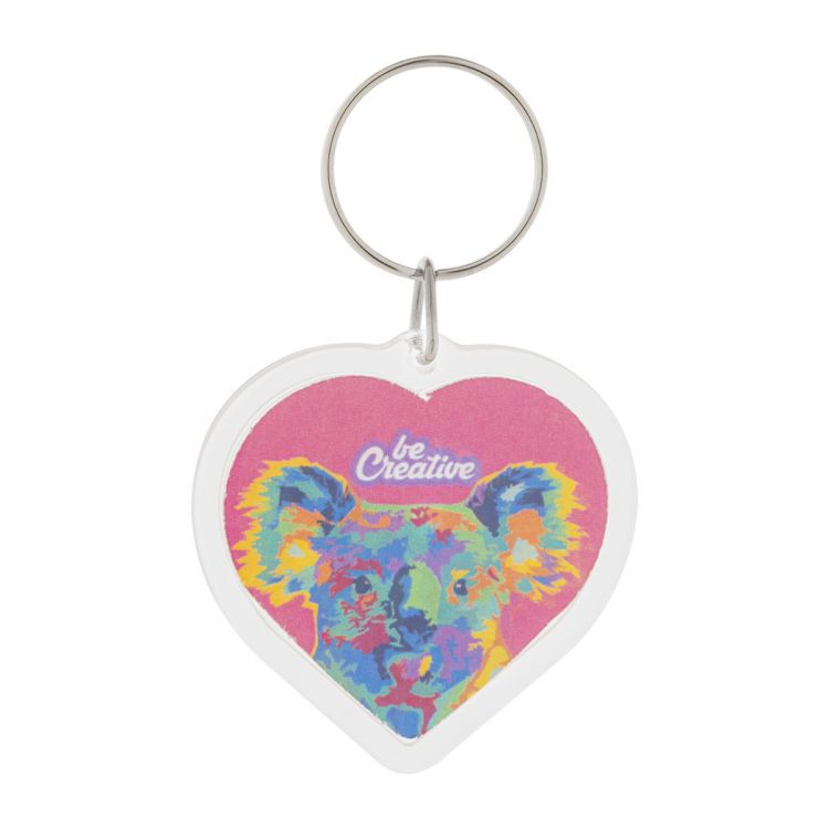 Porte-clés en acrylique en forme de cœur avec insertion de papierpersonnalisé sur base de quadri et anneau en métal. Le prix comprend l'impression numérique sur les deux faces. Quantité minimale : 100 pièces
