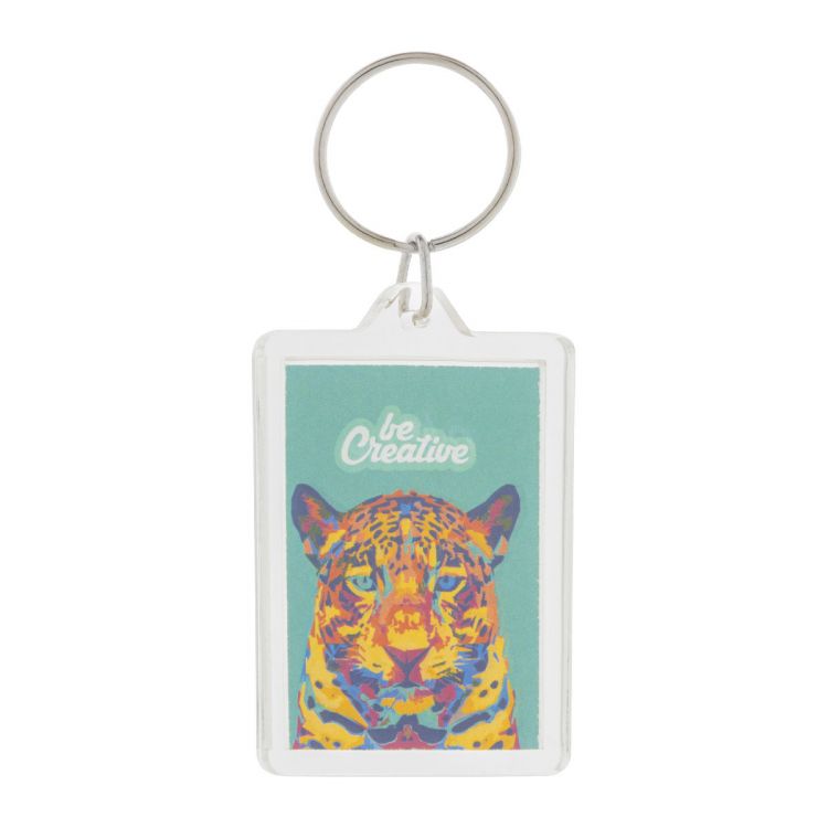 Porte-clés en acrylique de forme rectangulaire avec insertion de papier personnalisé sur base de quadri et anneau en métal. Le prix comprend l'impression numérique sur les deux faces. Quantité minimale : 100 pièces
